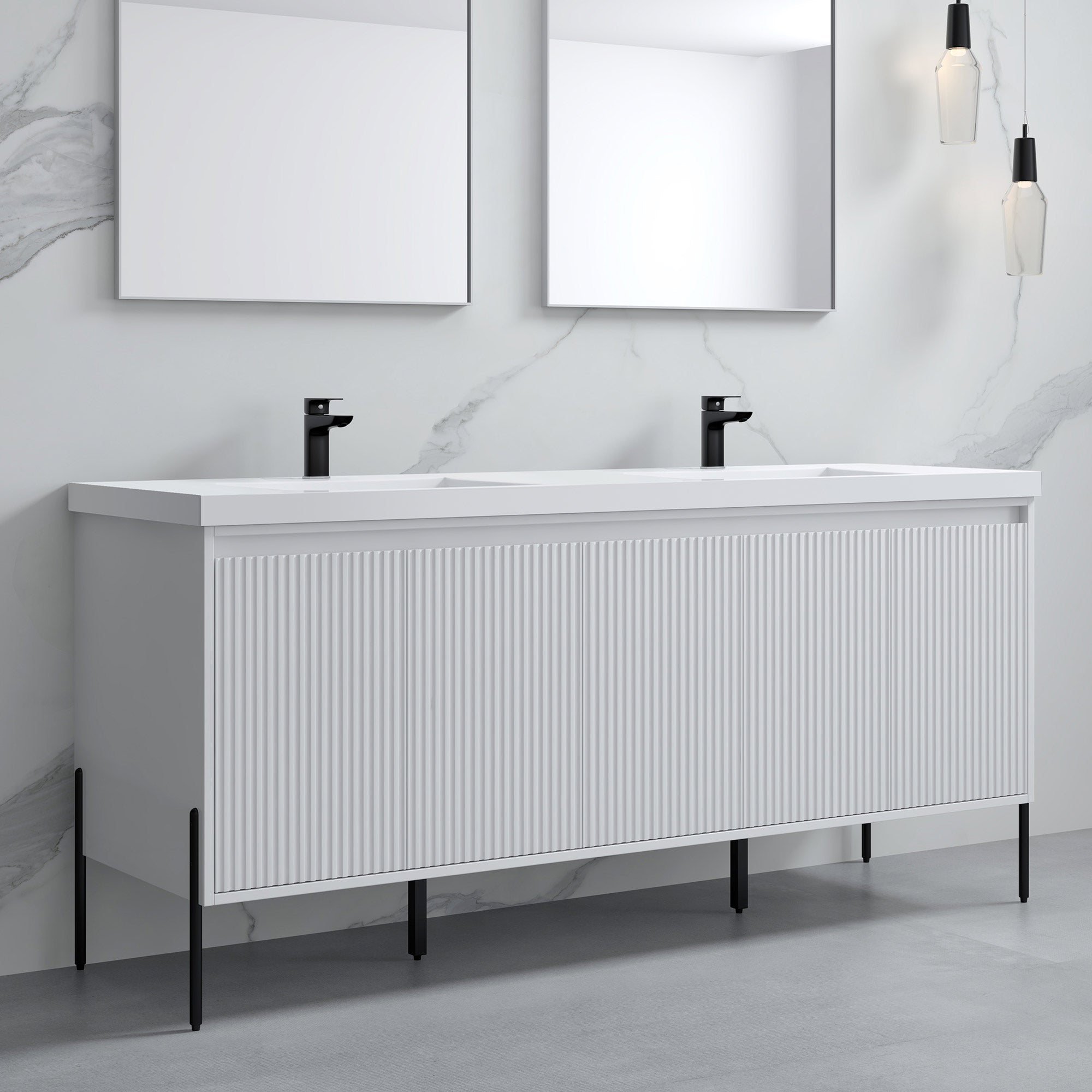 Enhance your bathroom with this modern fluted-style vanity sink set, crafted for both functionality and elegance. The striking vanity showcases subtle fluted detailing, complemented by sleek, slim legs that exude contemporary sophistication. Thoughtfully designed with soft-closing doors, it reveals ample storage space for toiletries, towels, and other essentials. Built with durable materials, this vanity ensures lasting quality and seamlessly integrates into any bathroom layout.