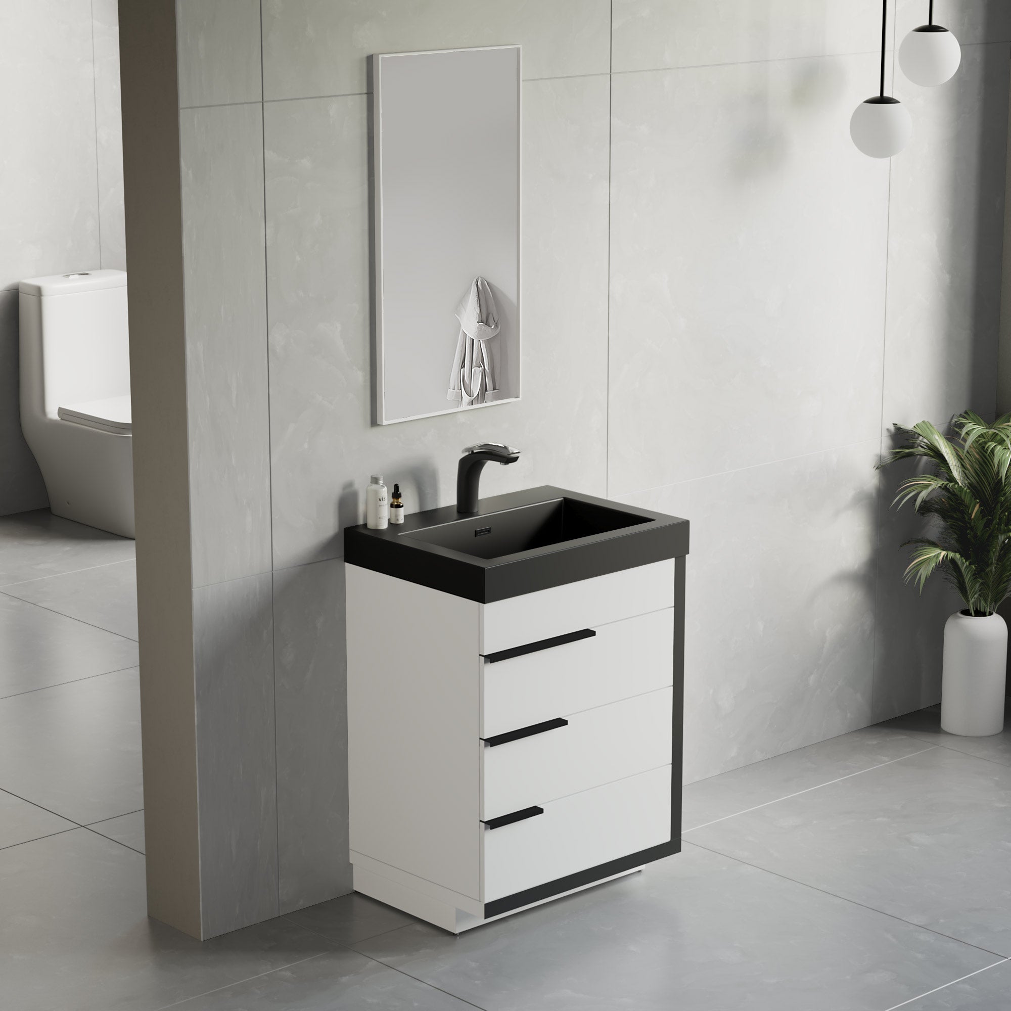 Bold design. Smart storage. Effortless style. The 024 Series freestanding bathroom vanity set brings modern elegance to your space with its crisp white cabinet, matte black trim, and premium black resin basin. Crafted for high-impact visual appeal and everyday function, this vanity features soft-close drawers for smooth, silent storage and a sleek silhouette that complements any contemporary bathroom.