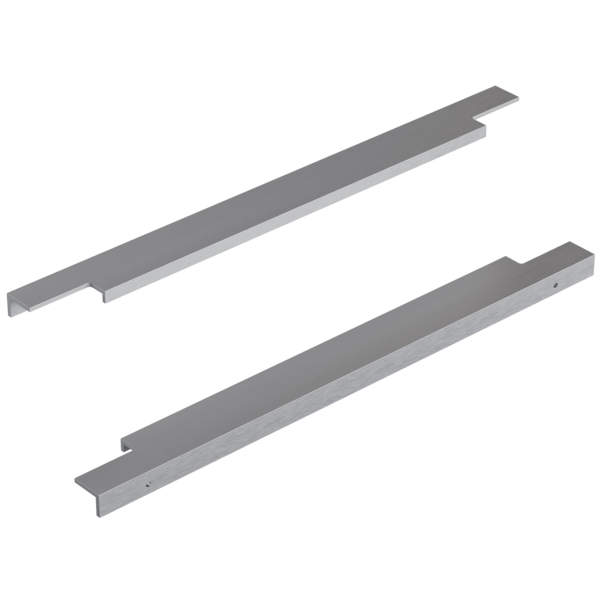 Dowell 3063 018 aluminum cabinet drawer/door pulls/handles in black and brushed satin/silver/black fit on the edge of the drawer or door and are 17-7/8" in length. They are attached to the inside of the drawer/door face via screws where the screw holes are 14-3/4" center-to-center (C-C).