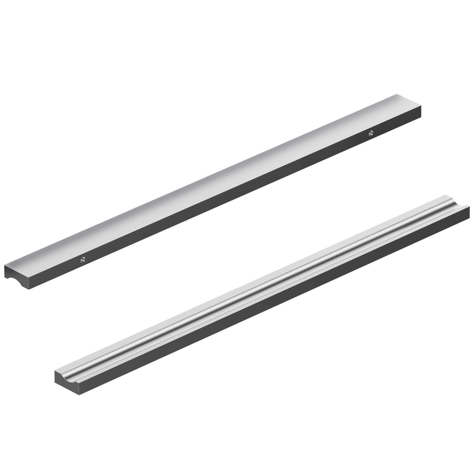 Dowell 3064 300 aluminum cabinet drawer/door pulls/handles sit 3/4" high on the drawer/door face and are 11-3/4" in length. Available in chrome, black and brushed brass, each pull/handle is 5/16" thick with a grooved underside finger grip. They are attached to the outside/front of the drawer/door face via screws where the screw holes are 8-5/8" center-to-center (C-C).