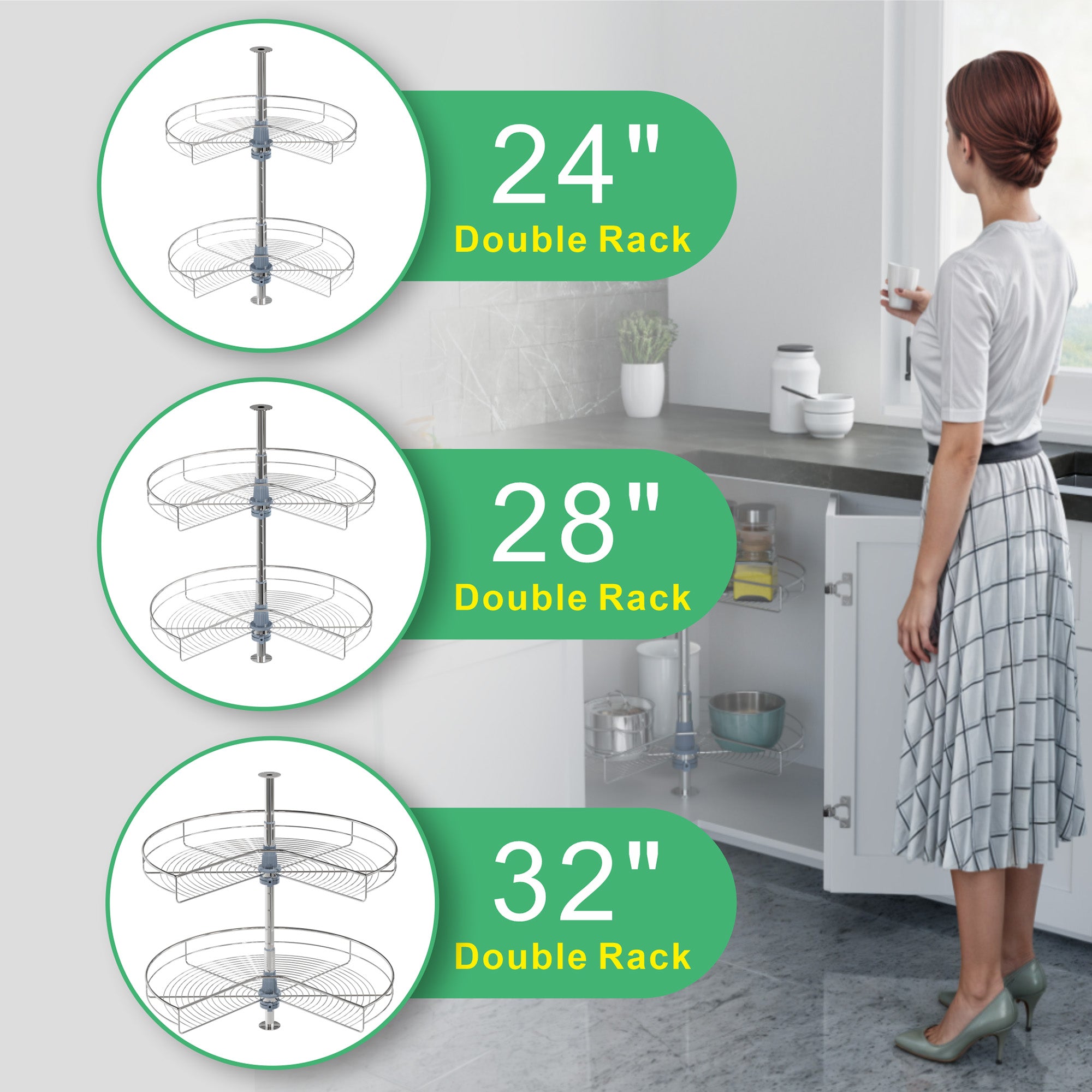 Dowell 24"/28"/32'' 2 Tier Lazy Kitchen Base Cabinet Corner Organizer with 270° Rotation. This chrome kidney-shaped lazy corner cabinet organizer is equipped with two spacious independently rotating storage shelves and is available in diameters of 24, 28 and 32 inches. Ideal for neatly arranging tall bottles, cups, pans, storage cans, and various other items, the ample capacity effortlessly caters to your daily storage requirements.