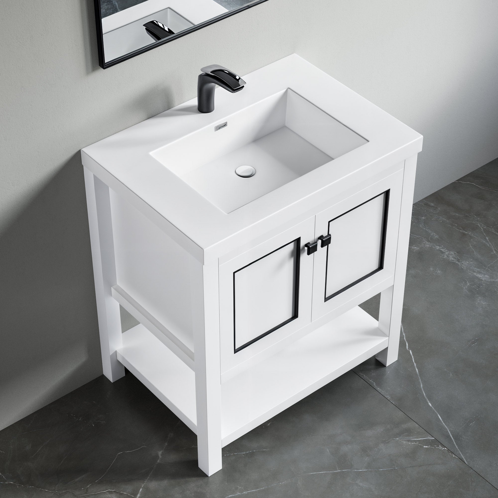 Dowell 036 30 freestanding vanities offer a modern and minimalist aesthetic featuring plenty of room for storing or displaying bathroom and powder room essentials. Available in white with inlaid black, white with inlaid golden and blue with inlaid golden, each with a white resin basin. The 30" vanity bases are 21-1/4" deep and have two soft-close doors and an open bottom shelf. All vanity sets can be paired with various components available separately from Dowell including a wide array of faucets and mirrors.