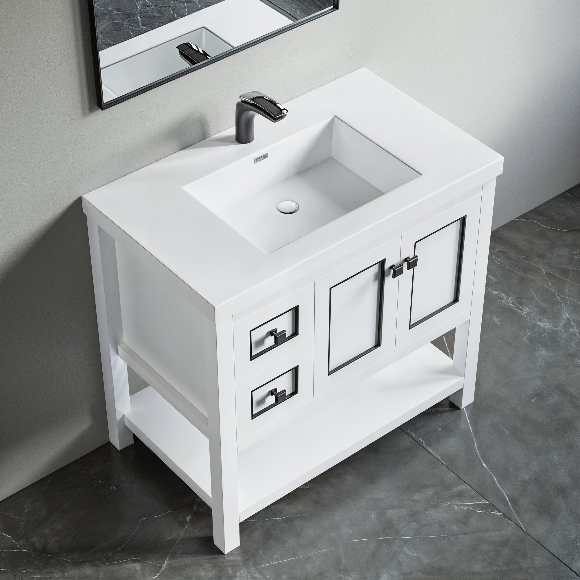 Dowell 036 36 freestanding vanities offer a modern and minimalist aesthetic featuring plenty of room for storing or displaying bathroom and powder room essentials. Available in white with inlaid black, white with inlaid golden and blue with inlaid golden, each with a white resin basin. The 36" vanity bases are 21-1/4" deep and have two soft-close doors and one soft-close drawer and an open bottom shelf. All vanity sets can be paired with various components available separately from Dowell including a wide array of faucets and mirrors.