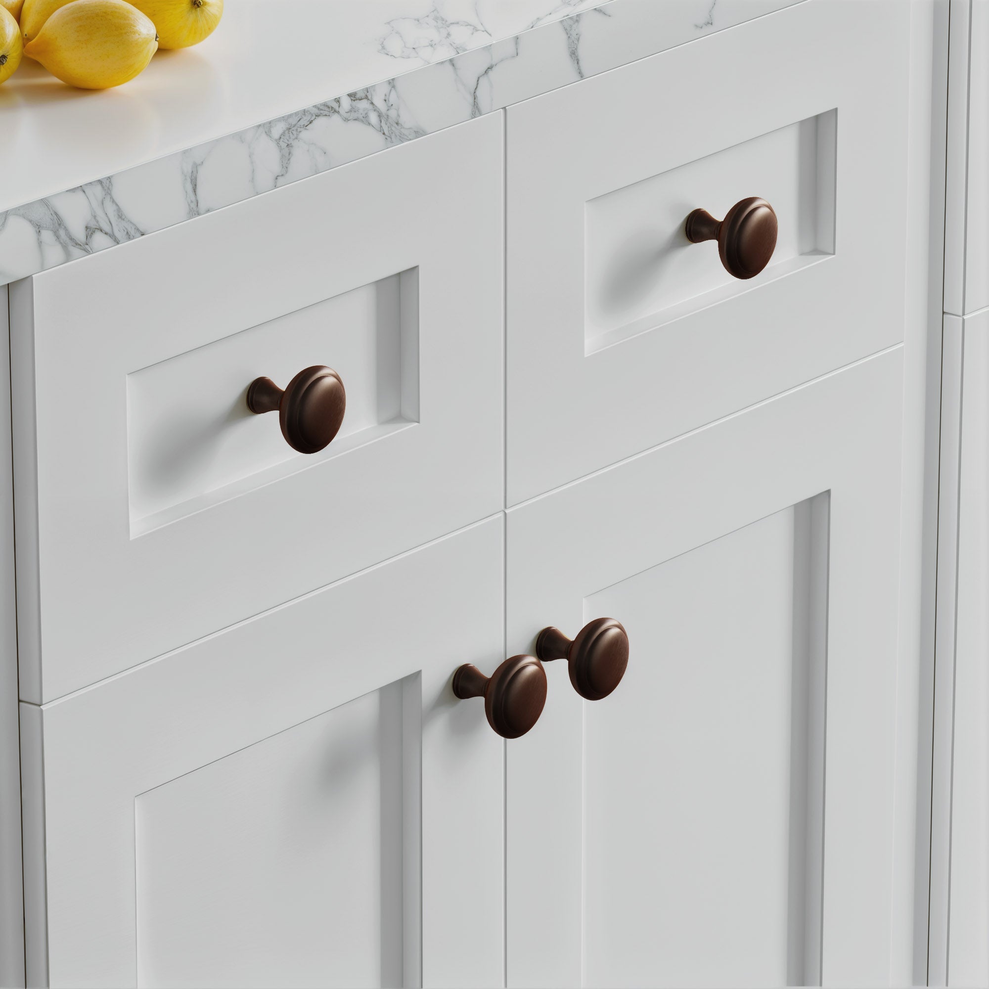 Dowell 3185 030 round zinc alloy cabinet drawer/door knobs sit 1-9/32" high on the drawer/door face and have a diameter of 1-1/4". Available in brushed brass, brushed satin nickel, oil rubbed bronze, they are attached to the outside/front of the drawer/door face via screws attached from the inside of the drawer/door.